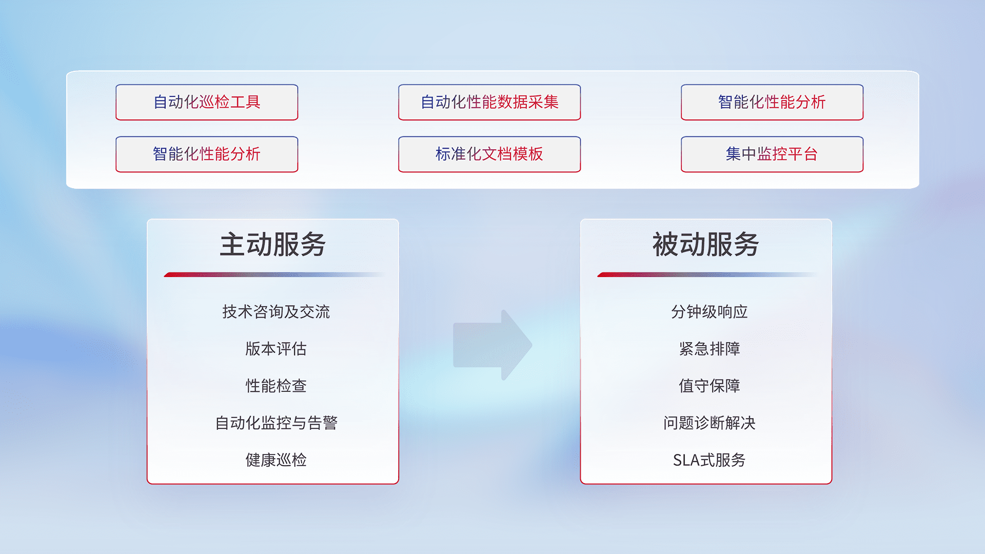 智能化工具和标准化文档,,,保障服务质量,,,,提供主动服务(包含技术咨询、、、版本评估、、性能检查、、、自动化监控与告警、、、、健康巡检)和被动服务包含(分钟级响应、、、紧急排障、、、、值守保障、、问题诊断解决、、SLA服务)。。。