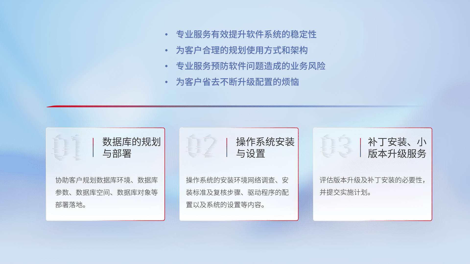 为客户提供软件规模升级、、快速部署、、、按需配置的专业服务,,,,从数据库的规划与部署到操作系统的安装与设置,,,,再到补丁安装和小版本升级提供支持。。。。